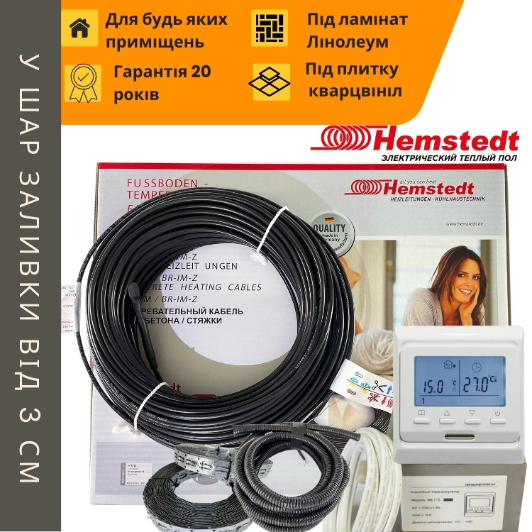 Комплект теплої підлоги, електричний нагрівальний кабель для укладання в стяжку Hemstedt BR-IM + програмований терморегулятор in-therm E51